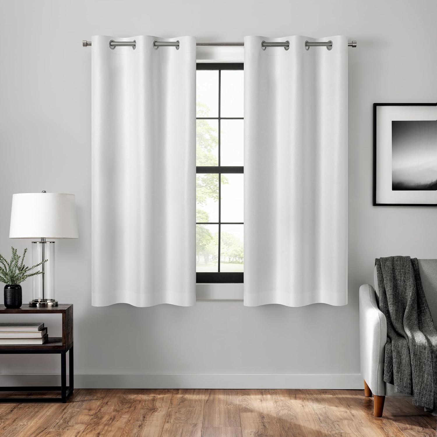 Add a subtle elegance to your room with the Eclipse Magnitech Welwick Herringbone solid curtain panel. The Absolute Zero blackout curtain panel blocks out 100% of unwanted light. The Magnitech technology eliminates the light gap between panels, providing maximum light blocking. Perfect for your entertainment room to eliminate screen glare or in your bedroom for enhanced privacy and a better night’s sleep. Hidden magnetic closures make it simple for you to seal your curtains shut. Magnets are sewn into both the right and left side hems of the curtain panels, allowing you to create a seamless wide width window treatment by linking multiple curtain panels together. Maximize comfort, with the Eclipse Thermaback coating that help keep the summer heat and winter chill out of your home. Metal grommets make it easy to open and close your curtain panels. Grommets fit a curtain rod up to 1.25” in diameter. Sold as individual panels. Measure carefully before selecting your desired size and quantity. Rod not included.
